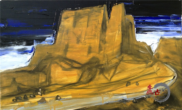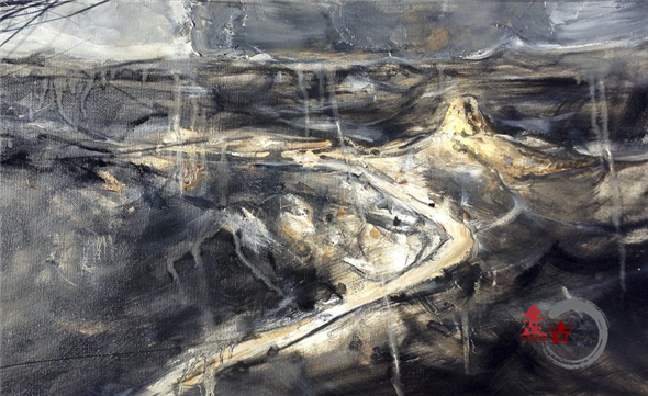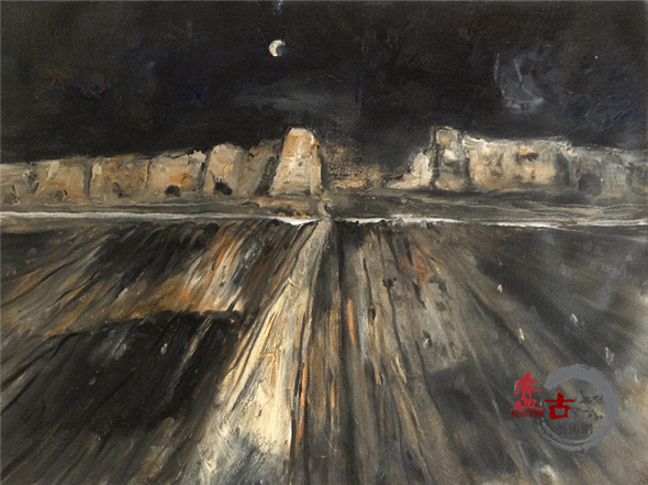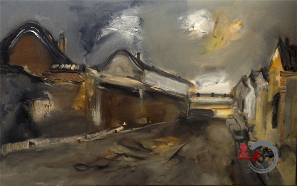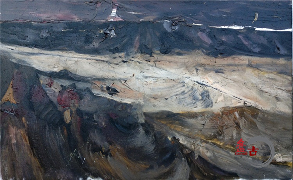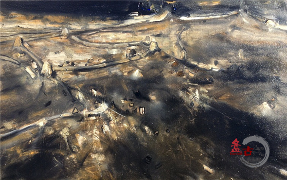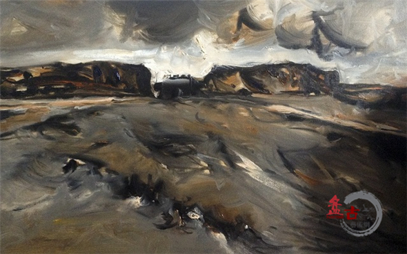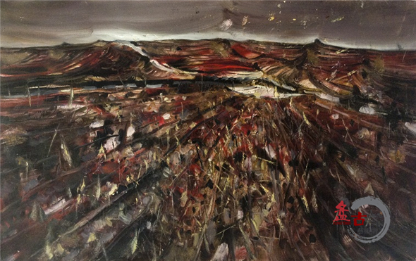 从晋北大地回到北京,脱忠伟就约我去看画。当我面对一幅幅散发着浓重油彩味道的原作时,当我面对扑面压来的枯黄的土地、墨黑如夜的阴沉和那凝涩厚重的笔触时,一种难以言说的沉重感觉充溢着我的脑海。沉厚的土地,如墨的世界,孤独的城堡,残阳的余晖,凝重的苦涩和阴郁的深沉,这是画家眼中的晋北大地,是画家在自觉不自觉中对于晋北大地的独立个人思考,是画家灵魂与晋北土地的对话,是晋北大地赋予画家的心灵感受。