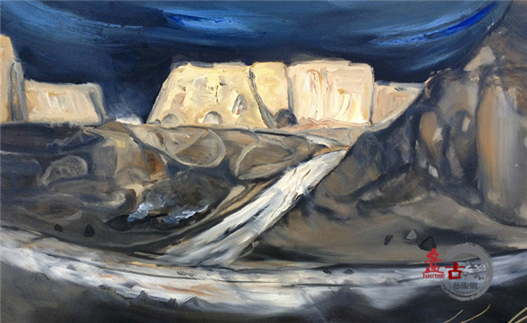 2013年从深秋到初冬,脱忠伟背着行囊,怀着对艺术的迷恋,冒着晋北大地的寒风,用他深沉的思考和凝重的笔触描绘着晋北的苍茫大地。晋北大地的雄浑厚重,寒风中古堡的肃穆沉郁,黄沙飞扬的恢弘苍凉,自然的苦涩,人文的凝滞,历史的记忆,激荡着画家敏感细腻的神经。每一片黄土地的故事,每一个断垣城堡的过去,历史的遗迹和现代文明的交映,激活着画家的思考,每天都有每天的感动、思考、怅惘,喜悦,悲凉,画笔随着思绪而游动,记忆着感人的力量。在近乎无意识的激情涤荡中,在二十多天的日子里,脱忠伟画出了30多幅写生作品。
